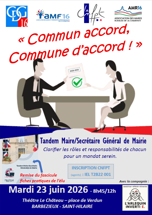 En cette année 2026 marquée par le renouvellement des mandats municipaux, l’objectif est de réunir le tandem Maire / SGM autour de la construction de leur relation, tout en clarifiant les rôles et responsabilités de chacun, le mardi 23 juin matin, à Barbezieux.
